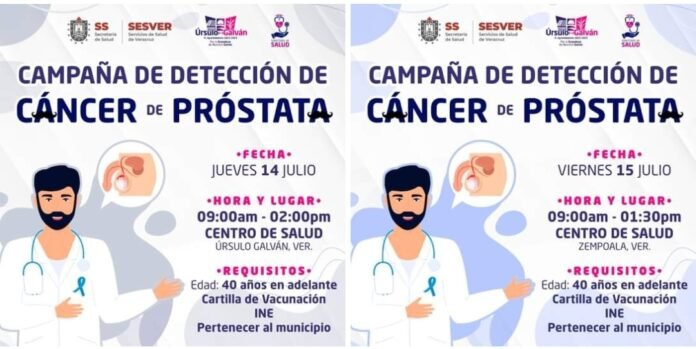Procurando la salud de los caballeros galvanenses con una iniciativa de conciencia preventiva, por instrucciones del Alcalde, Lic. Eder Jero Hernández Lara, la Dirección Municipal de Salud en coordinación con la Jurisdicción Sanitaria No. 8 llevará a cabo dos jornadas de detección de cáncer de próstata mediante muestra sanguínea en las localidades de Zempoala y Cabecera Municipal, este próximo jueves 14 y viernes 15 de julio.