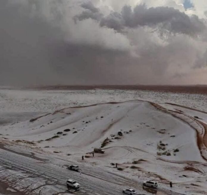 A través de redes sociales se han difundido imágenes donde se observa al desierto de Arabia Saudita cubierto completamente de blanco.