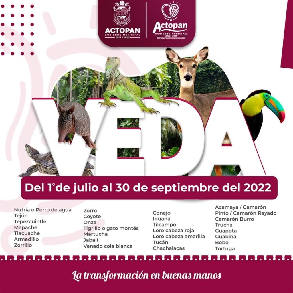 Por acuerdo del Cabildo de Actopan, Veracruz, se exhorta a la población del municipio a respetar la veda de flora y fauna silvestre y acuática de conformidad con las leyes vigentes de pesca y acuacultura y demás relativos a partir del 1 de julio al 30 de septiembre de 2022.