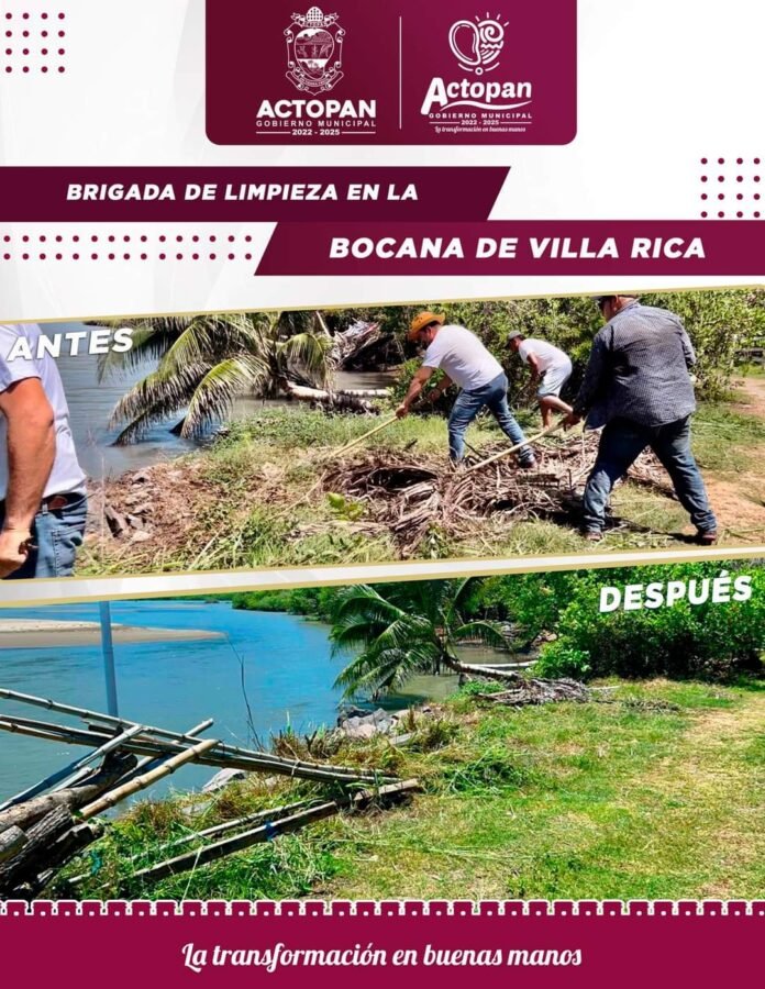 En una extenuante jornada de varias horas de duración, una cuadrilla del Ayuntamiento de Actopan, encabezados por la Alcaldesa María Esther López Callejas y el regidor Alan Ruiz Aguilar acompañados del Agente municipal y pobladores de la localidad de Villa Rica realizaron una brigada de limpieza y retiro de basura y desechos orgánicos en la zona conocida como La Bocana de Villa Rica.