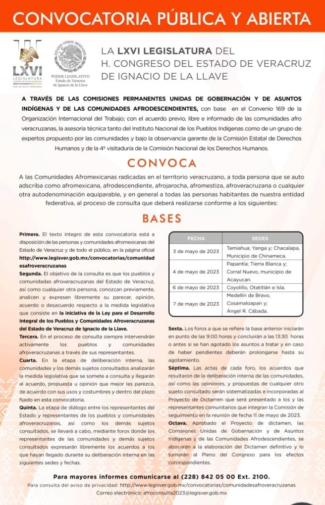 En el documento se convoca a las comunidades afromexicanas radicadas en territorio veracruzano, a toda persona que se auto adscriba como afromexicana, afrodescendiente, afrojarocha, afromestiza, afroveracruzana o cualquier otra autodenominación equiparable, y en general a todas las personas habitantes de la entidad federativa, al proceso de consulta conforme a las bases establecidas.