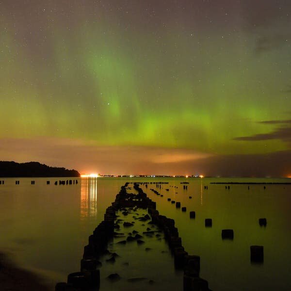 Las aguas de un golfo brillan con los reflejos de la aurora boreal en Gdynia, Polonia.