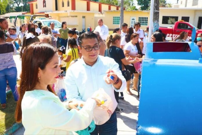 Inauguran contenedor de corazón para recaudar tapitas en Jareros, es el octavo en el municipio.