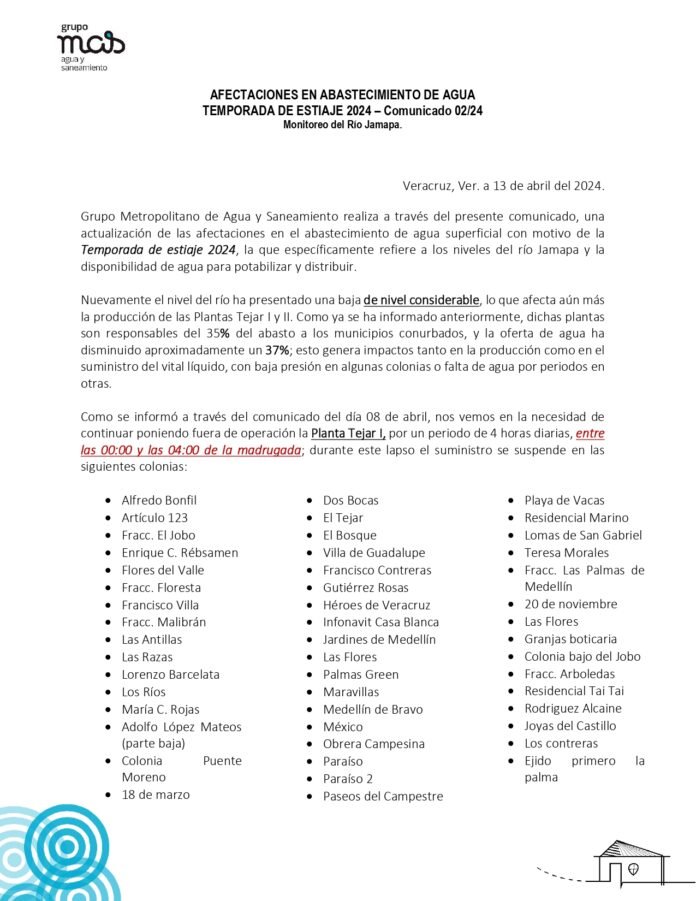 Grupo Metropolitano de Agua y Saneamiento (MAS) informa este sábado 13 de abril afectaciones en el abastecimiento de agua con motivo de la Temporada de Estiaje 2024, la cual afecta los niveles del Río Jamapa y la disponibilidad de agua para potabilizar y distribuir en la Plantas Tejar I y II.