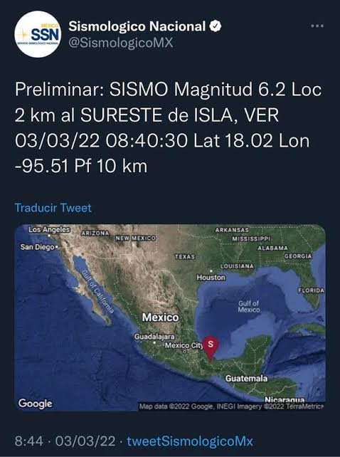 “Después del monitoreo preliminar debido al temblor que marcó el Sismológico Nacional como epicentro en Isla, Veracruz, reportamos que hasta el momento no se tiene ninguna novedad relevante. No hay afectaciones y se sigue monitoreando. Seguimos monitoreando y exhortamos a seguir las recomendaciones de Protección Civil”.