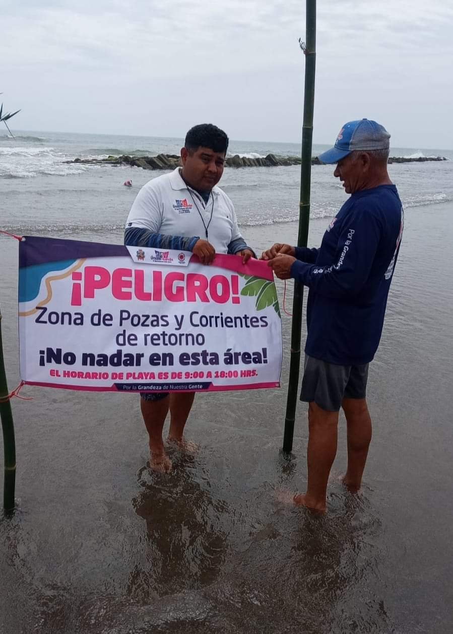Por instrucciones del alcalde, Lic. Eder Jero Hernández Lara, los operativos de Protección Civil municipal han colocado lonas en puntos de riesgo de ahogamiento en las playas de Chachalacas y Juan Ángel.