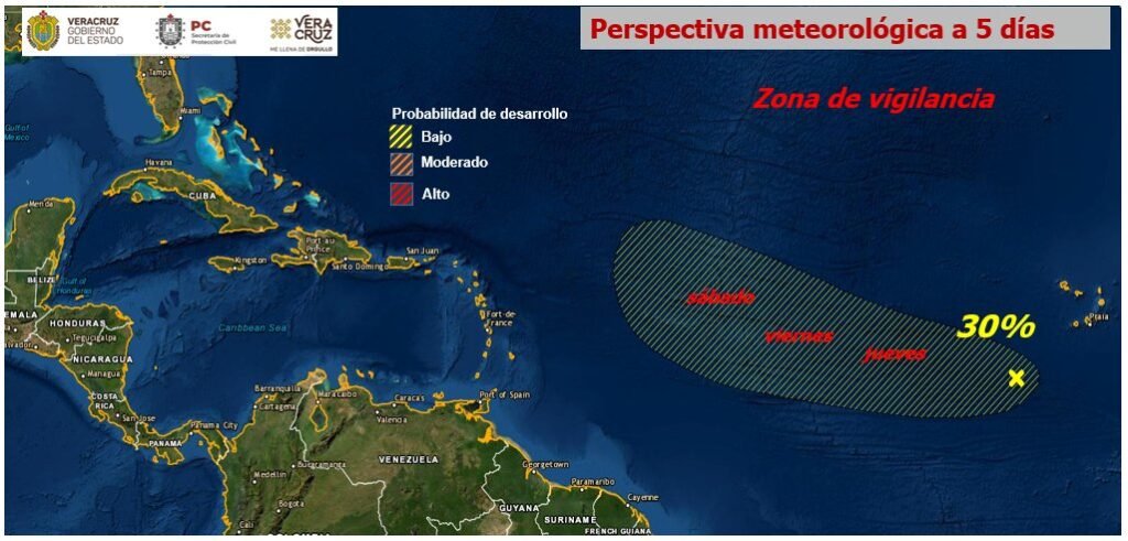 Con datos del Centro nacional de Huracanes de Florida, informa que han disminuido las condiciones, ahora se le asigna un 30% de probabilidad de evolucionar a ciclón tropical en 5 días.