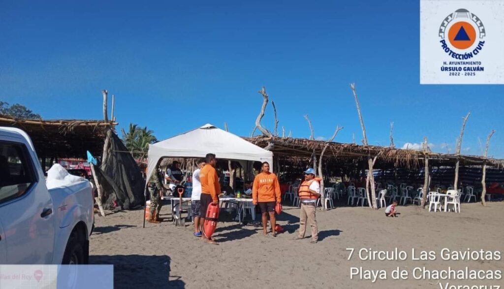 Trabajando sin parar en la prevención y cuidado de los vacacionistas, la dirección de protección civil municipal, en coordinación con la Secretaría de la Marina Armada de México, la Fuerza Civil unidad marítima y terrestre, la Secretaría de Protección Civil, Transito del Estado, hoteleros, restauranteros, palaperos y prestadores de servicios turísticos, continúan salvaguardardo la integridad de los visitantes en Playas del municipio de Úrsulo Galván, Veracruz.