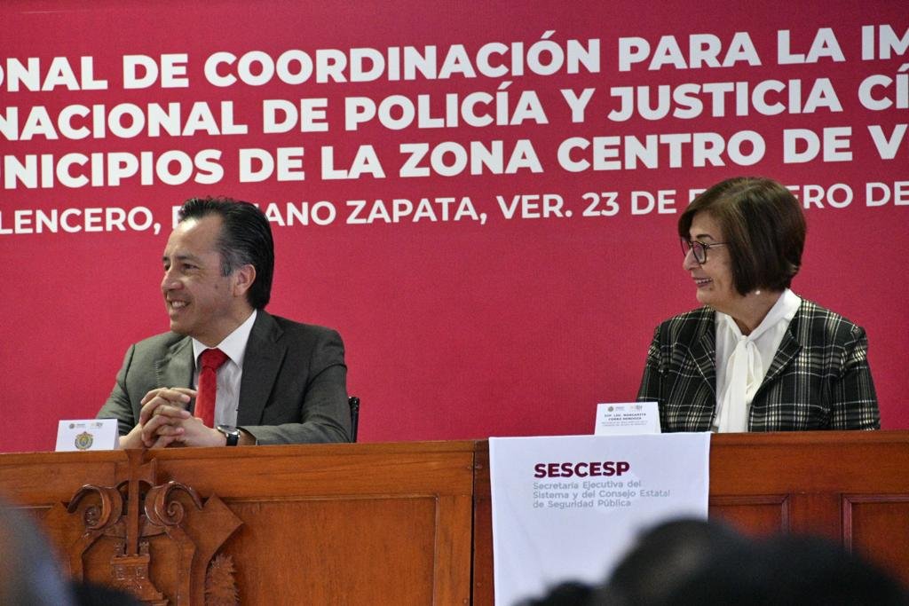 Esta mañana, la Presidenta de la Mesa Directiva acudió al Primer Foro Regional de Coordinación para la implementación del Modelo Nacional de Policía y Justicia Cívica en municipios de la zona centro de Veracruz, junto al gobernador Cuitláhuac García Jiménez; la presidenta del Poder Judicial, Lisbeth Aurelia Jiménez Aguirre; la fiscal general, Verónica Hernández Giadáns, y el secretario de Seguridad Pública, Cuauhtémoc Zúñiga Bonilla.